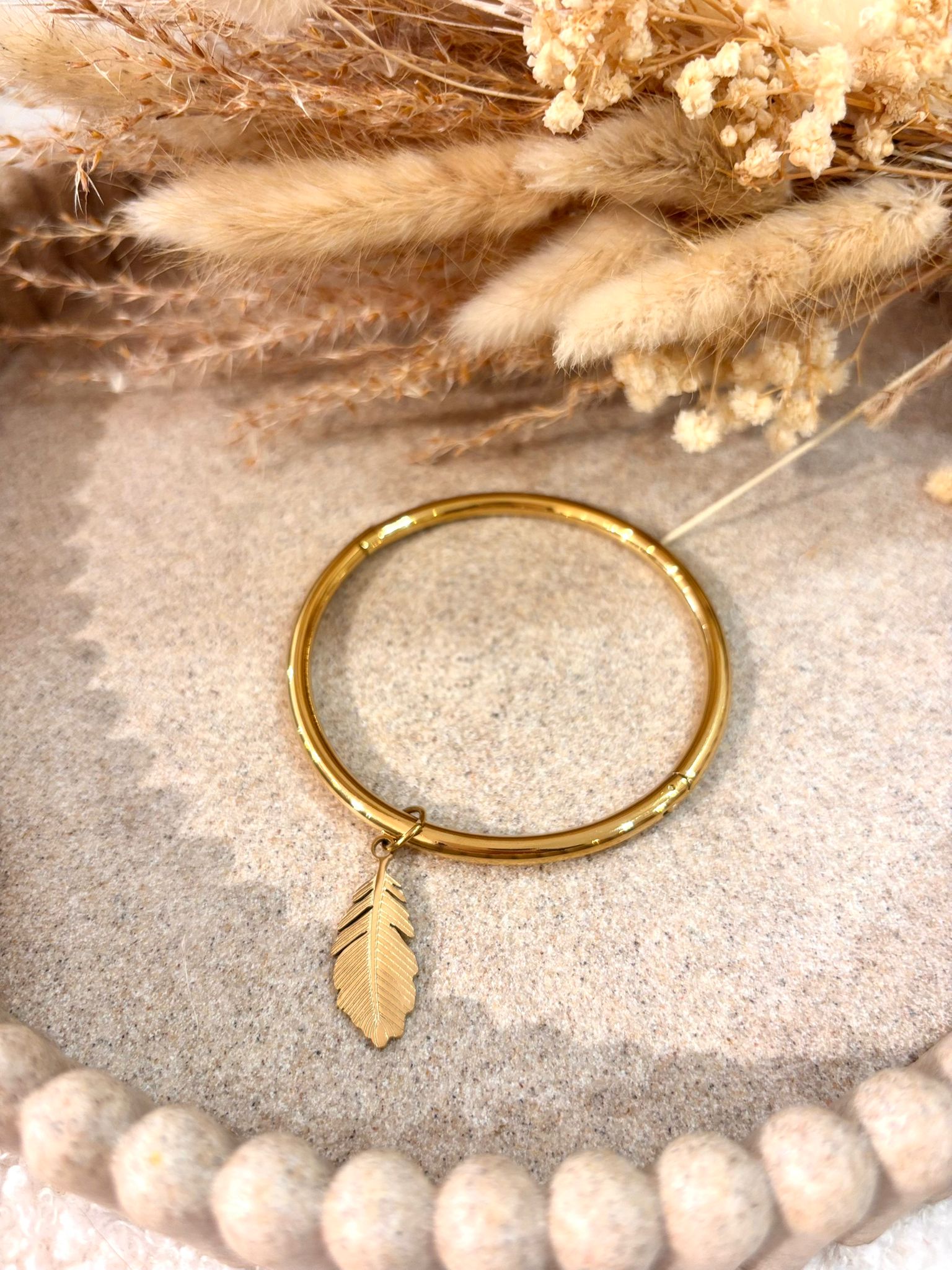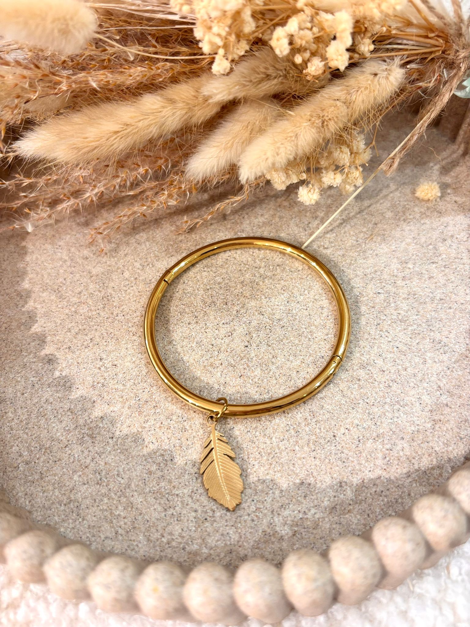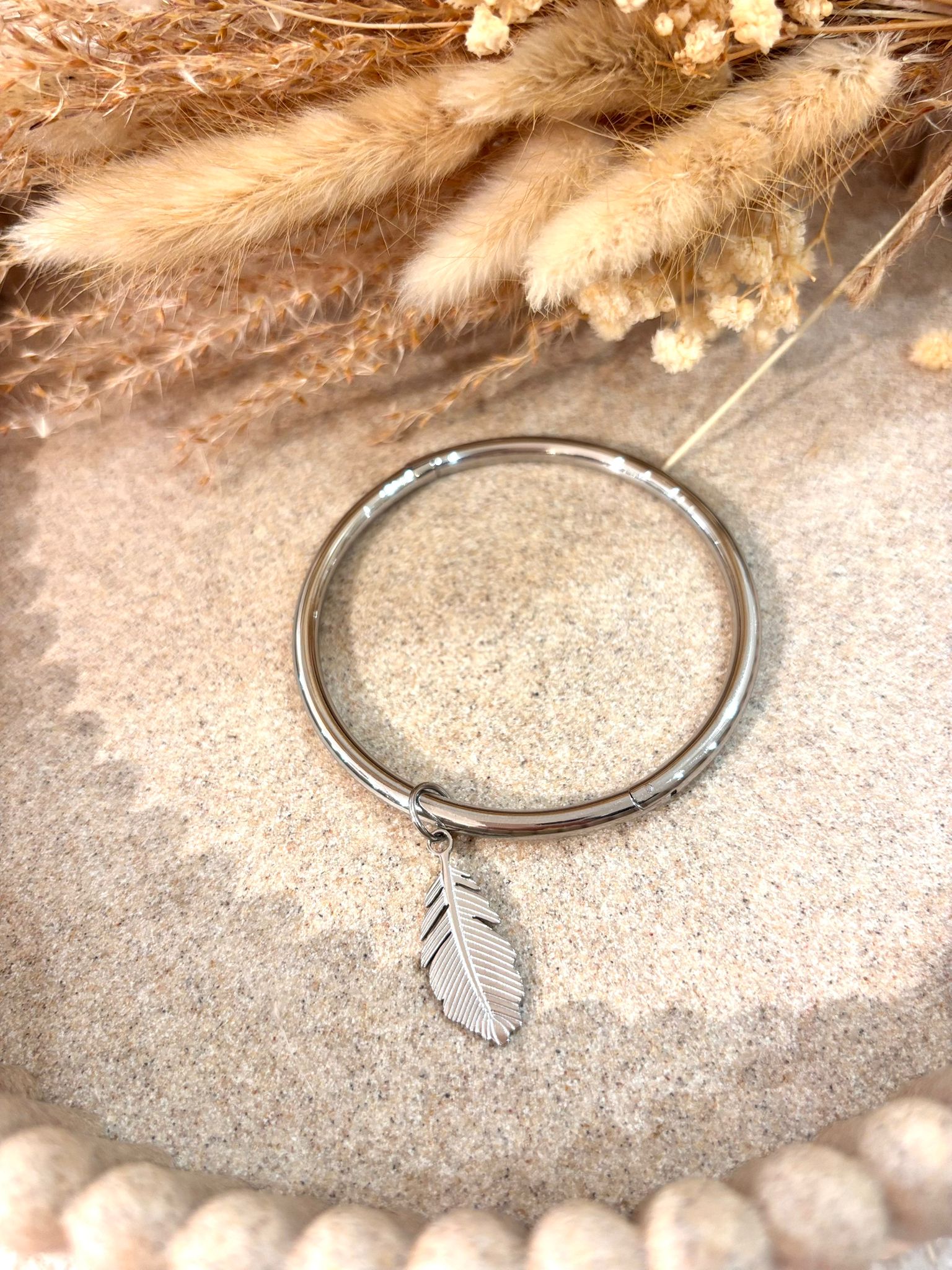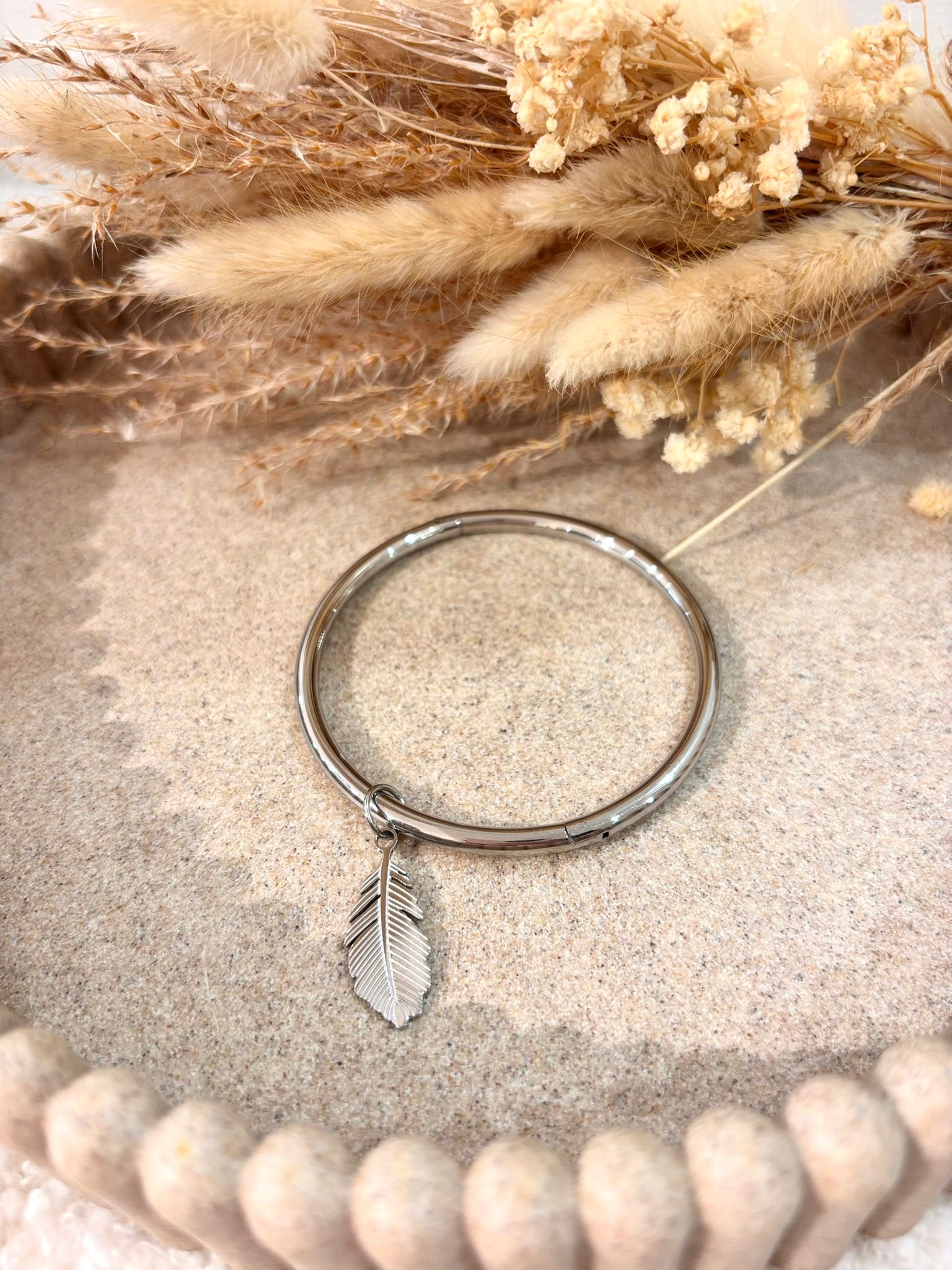 Jonc en acier inoxydable Plume délicatesse et légèreté au poignet, hypoallergénique et durable, parfait pour un style raffiné.